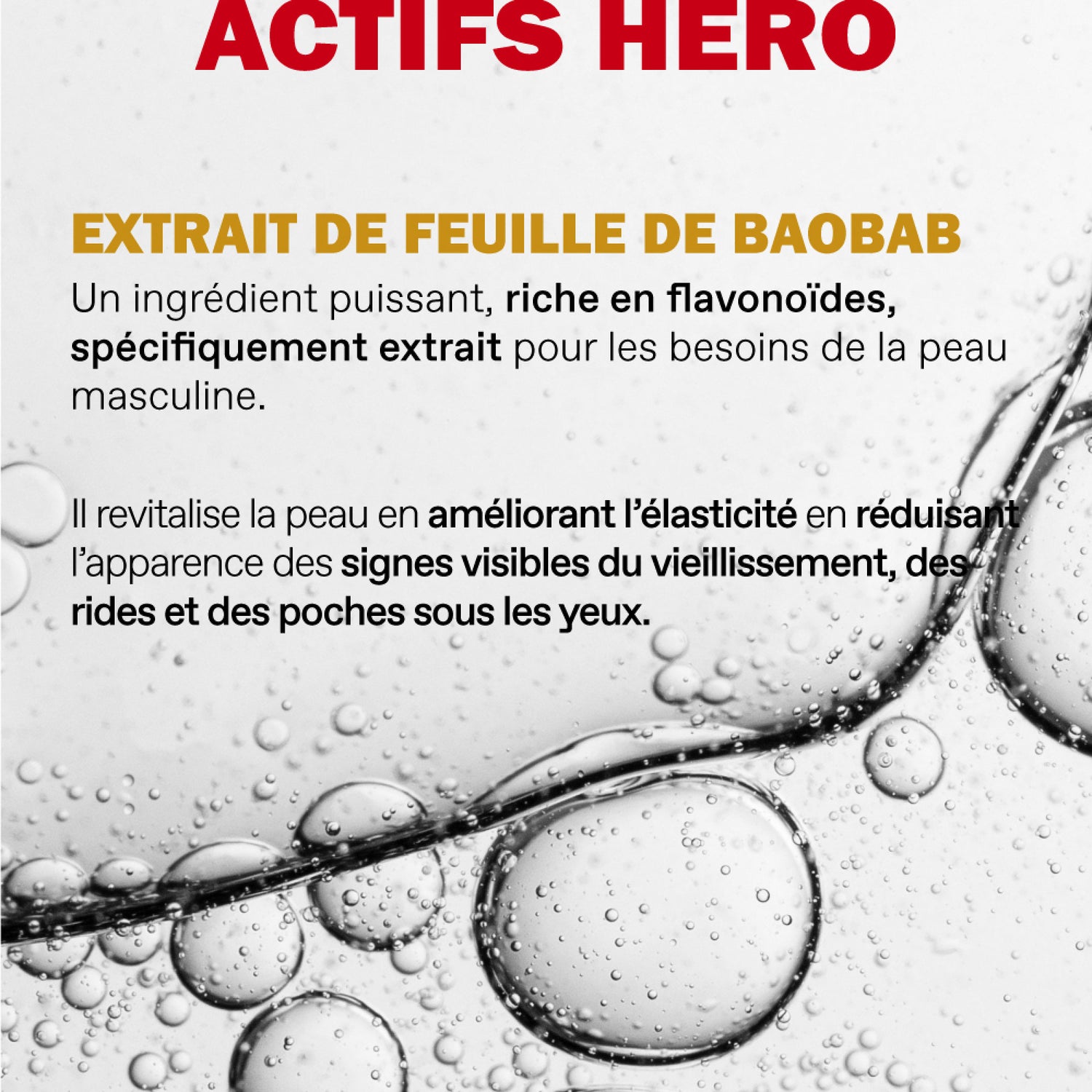 Formulé avec des extraits d’Achillea Millefolium et de feuille de Baobab, enrichis en antioxydants et flavonoïdes, ciblant les effets du photovieillissement et du vieillissement prématuré de la peau masculine.