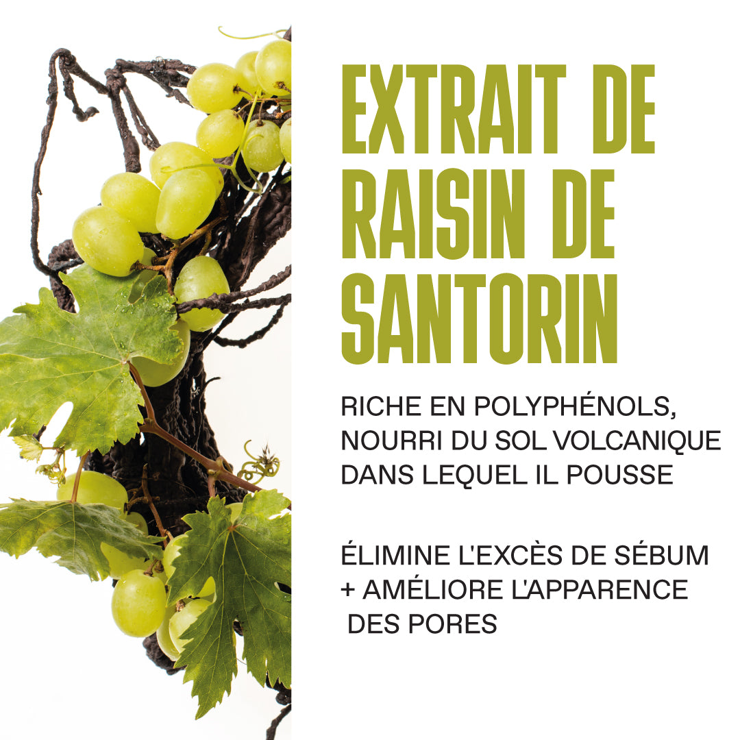 • EXTRAIT DE RAISIN DE SANTORIN : Nourri du sol volcanique dans lequel il pousse, riche en antioxydants et tanins, aide à éliminer l'excès de sébum et réduire l'apparence des pores.
