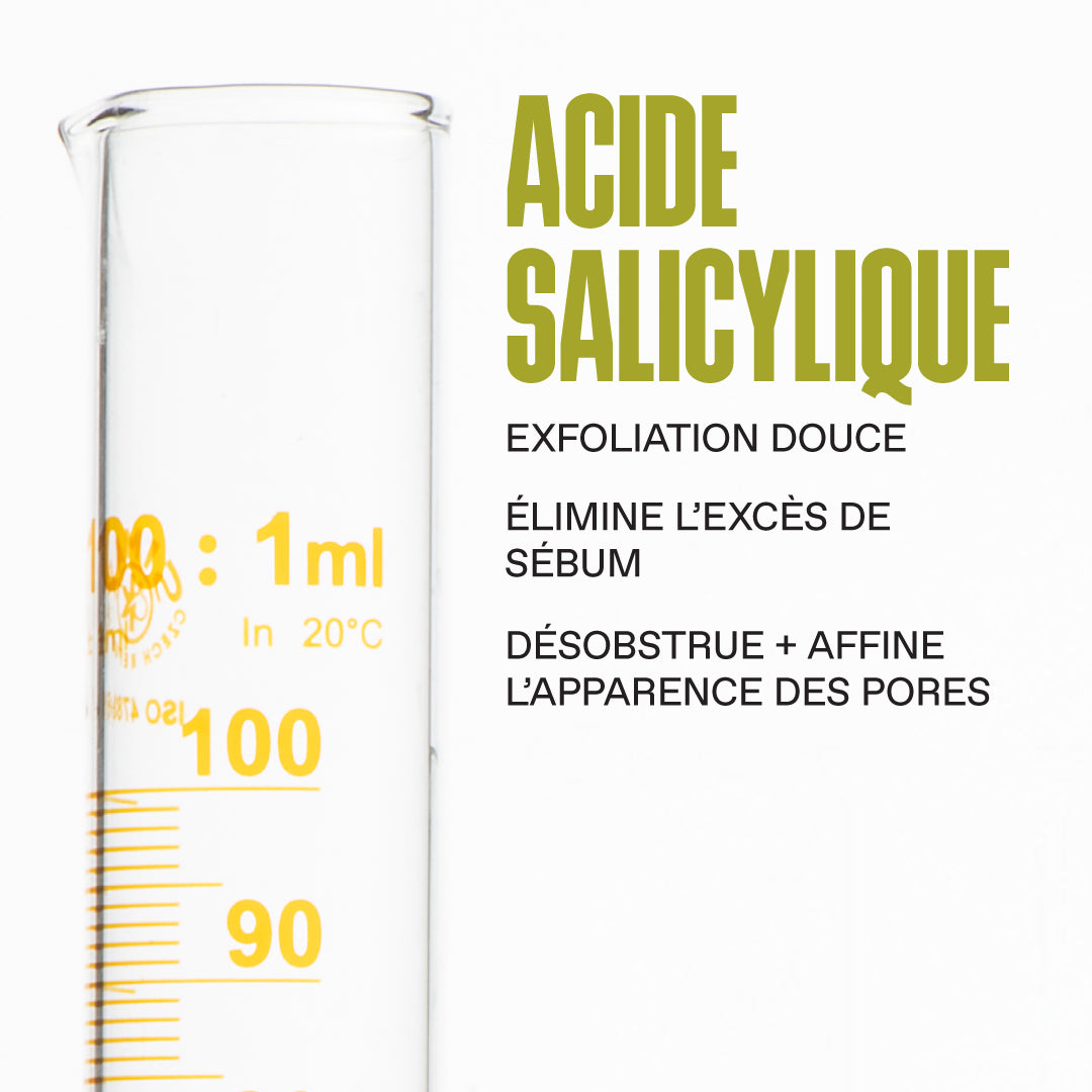 • ACIDE SALICYLIQUE : Un BHA qui exfolie en éliminant les cellules mortes de la peau, désobstrue et affine les pores.