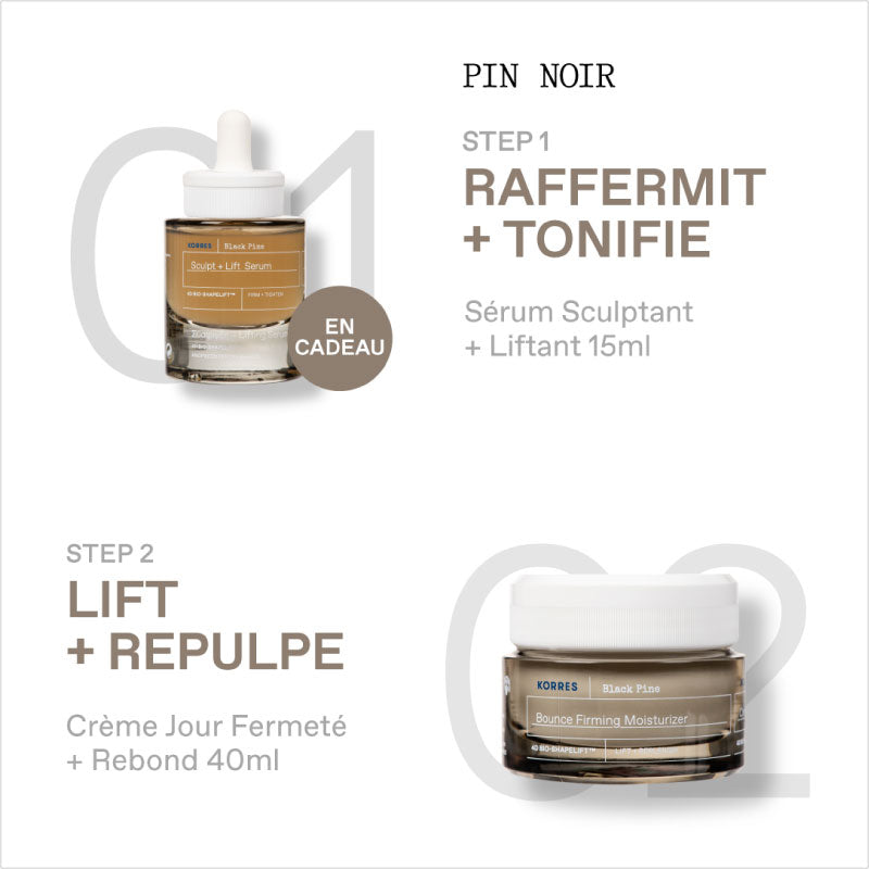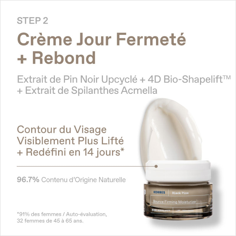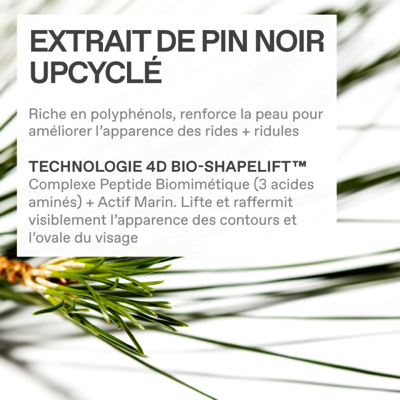 Le parfait Duo Lift + Fermeté enrichi en Extrait d’Aiguilles de Pin Noir riches en polyphénols + Technologie 4D BIO-SHAPELIFT™ pour améliorer la fermeté de la peau et lifter les contours du visage. Dès 45 ans.