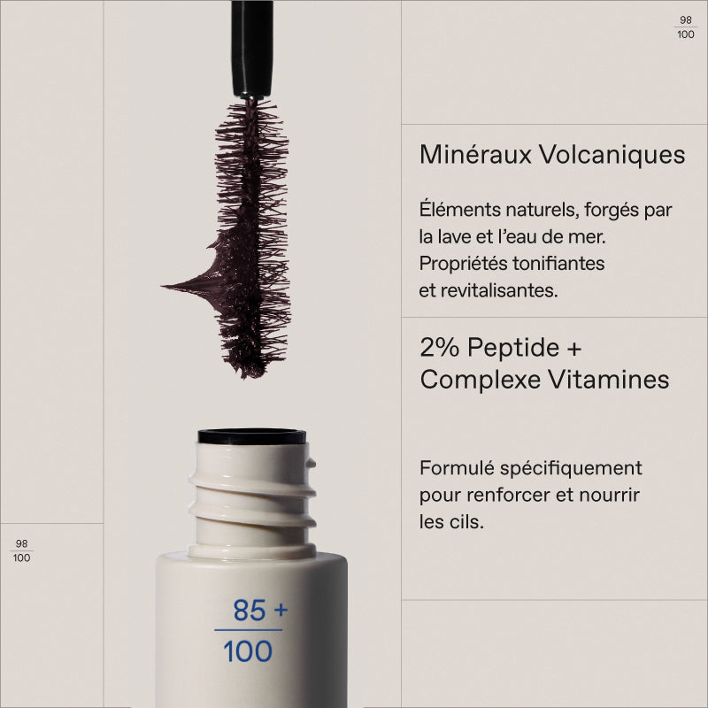 Infusé de Minéraux Volcaniques et d’un complexe de Vitamines et de Peptides, il renforce et nourrit les cils.