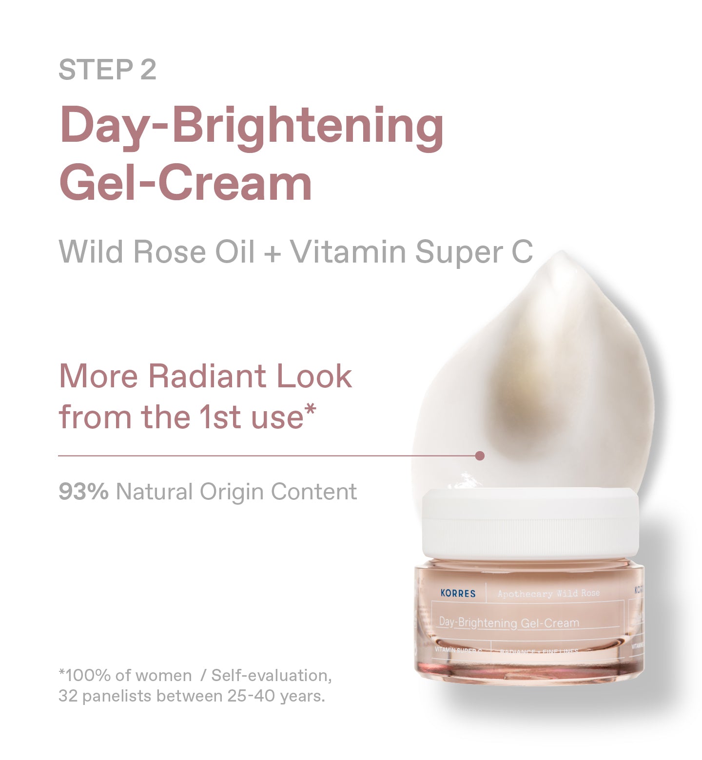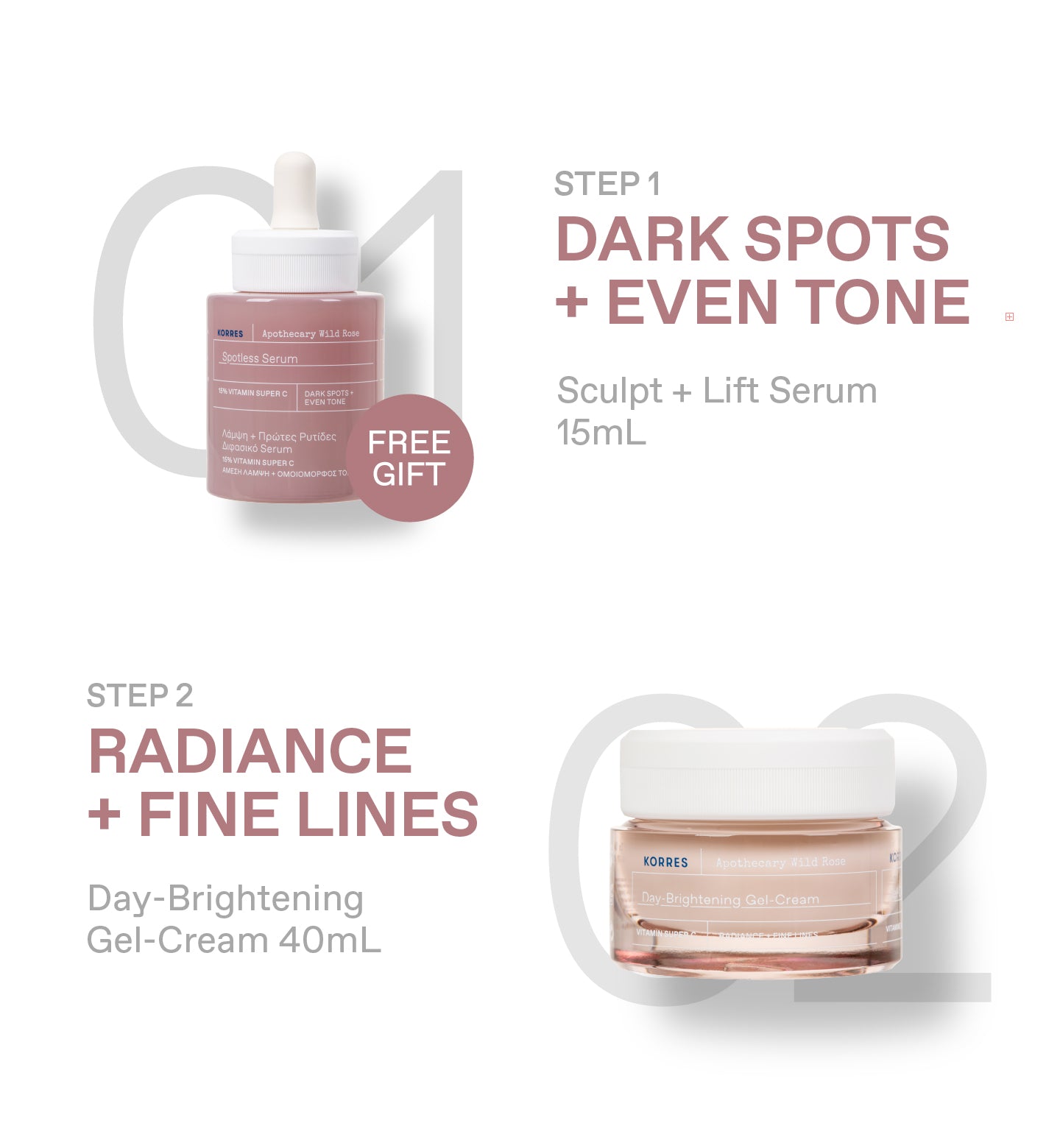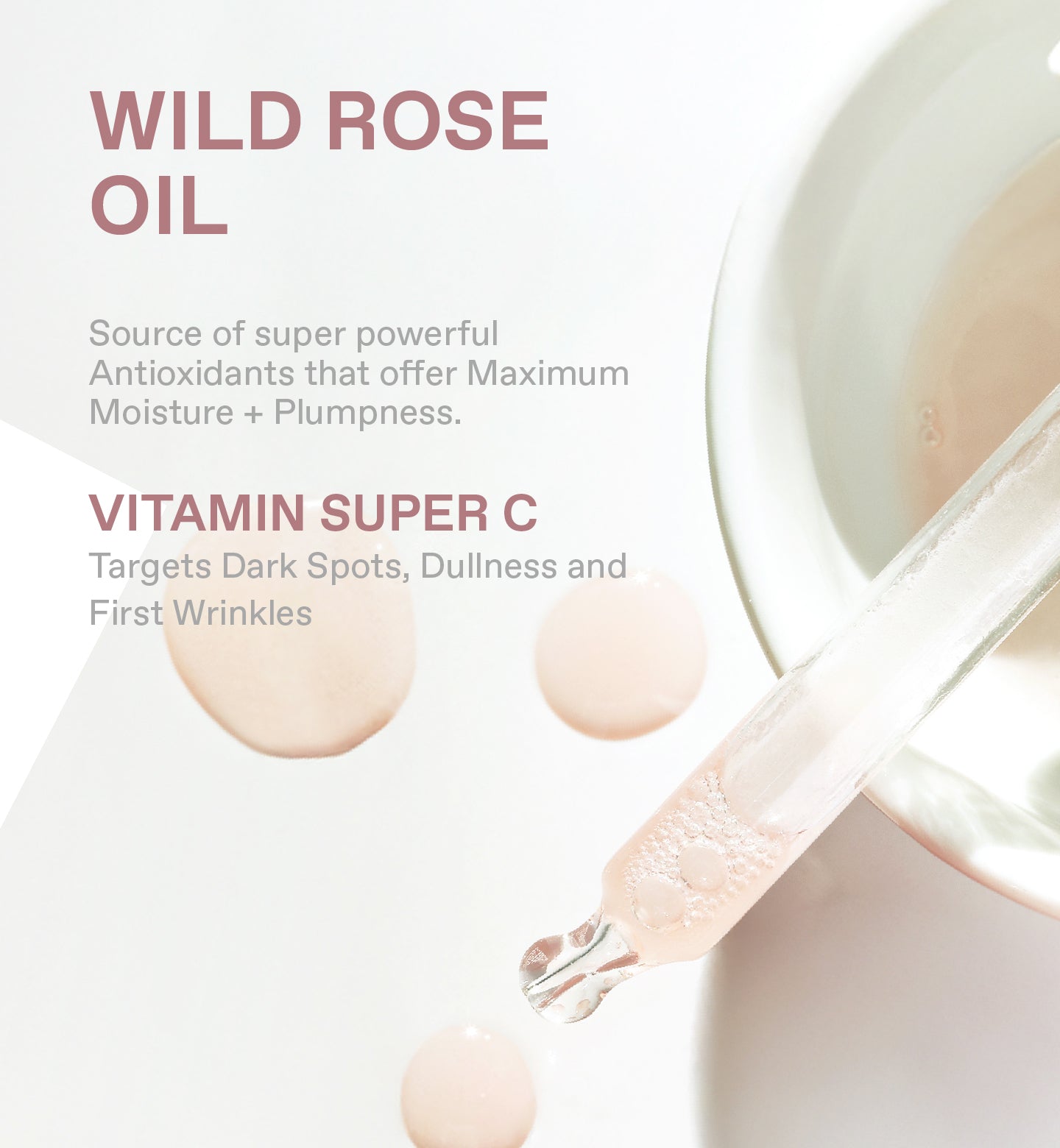 Notre Duo Éclat enrichi en Huile de Rose Sauvage, source d’omégas repulpants et en Super Vitamine C éclaircissante.