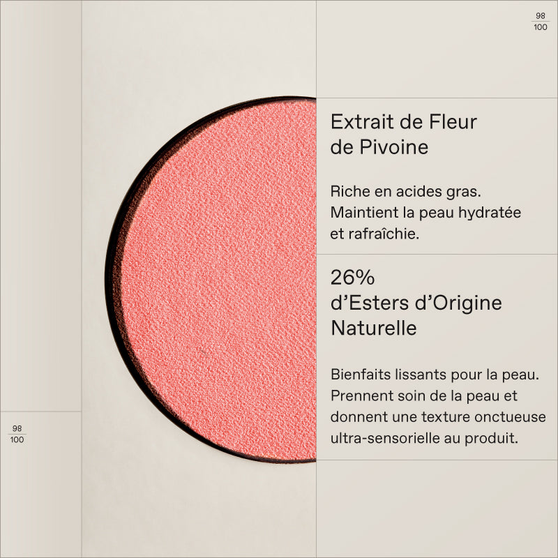 Infusé d’Extrait de Fleur de Pivoine et d’Esters d'origine naturelle. Offre un fini modulable pour un éclat bonne mine.