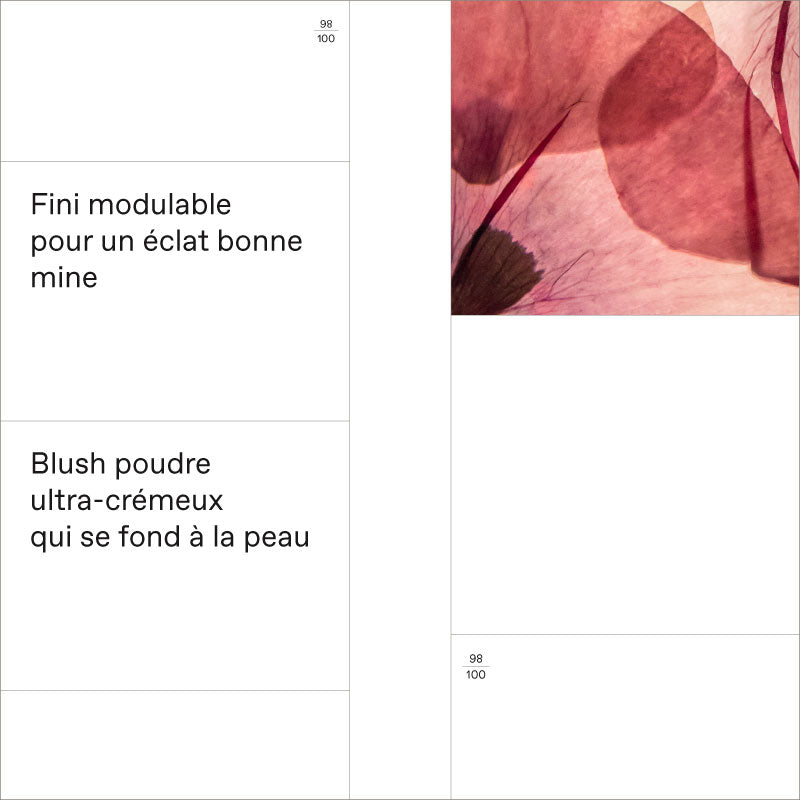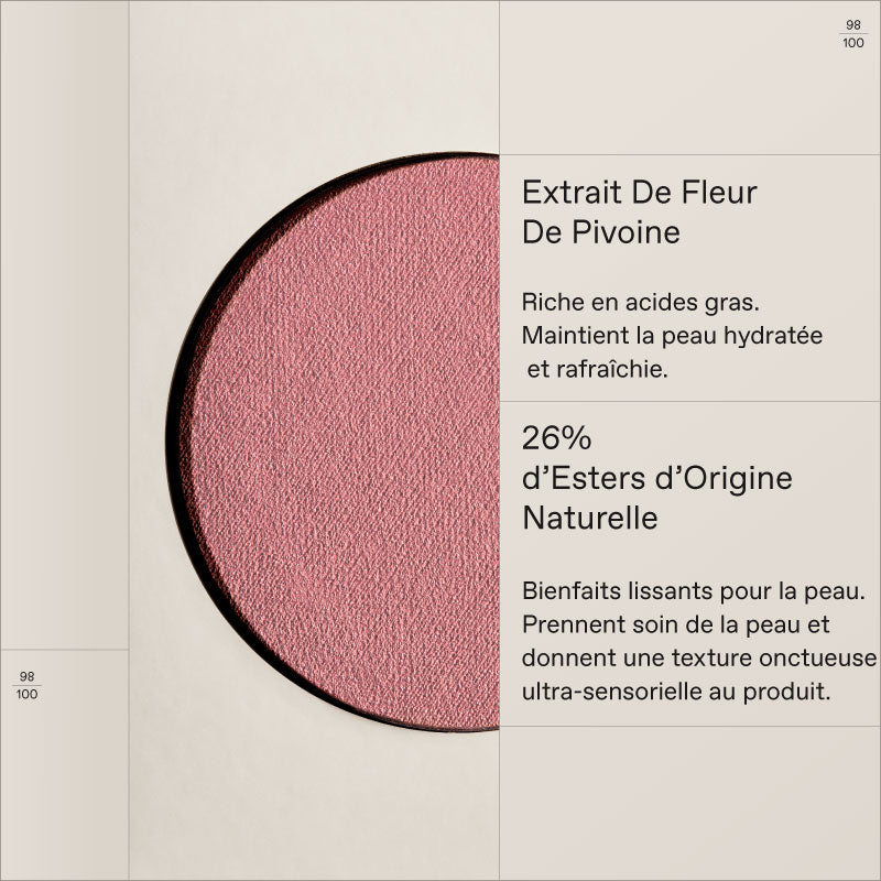 Blush poudre ultra-crémeux à la texture veloutée.  Infusé d’Extrait de Fleur de Pivoine et d’Esters d'origine naturelle. Offre un fini modulable pour un éclat bonne mine...