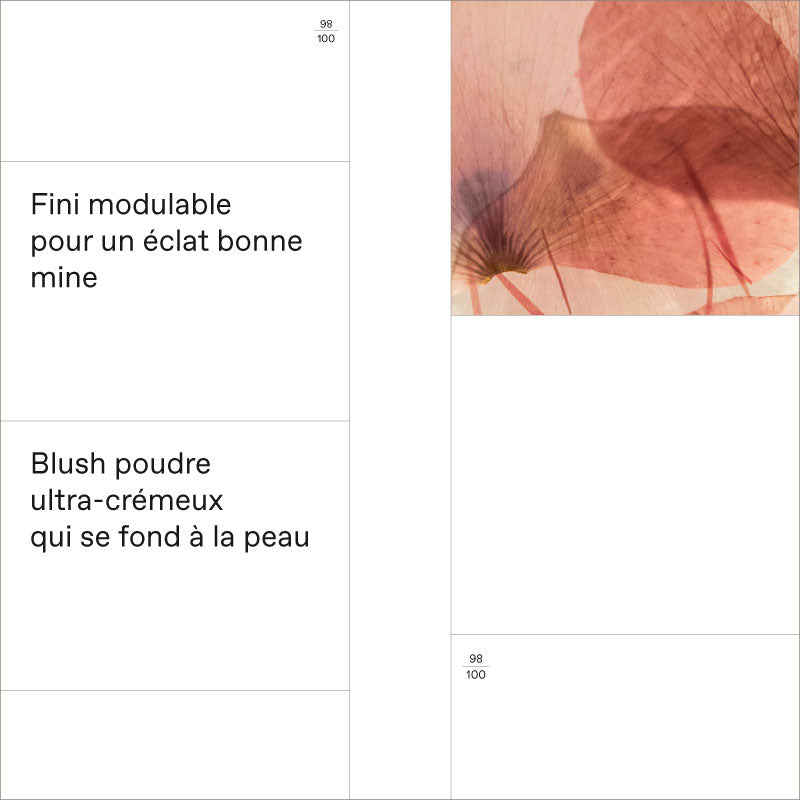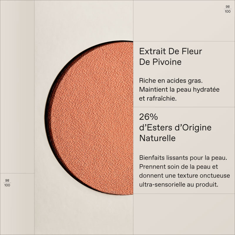 Blush poudre ultra-crémeux à la texture veloutée.  Infusé d’Extrait de Fleur de Pivoine et d’Esters d'origine naturelle. Offre un fini modulable pour un éclat bonne mine...