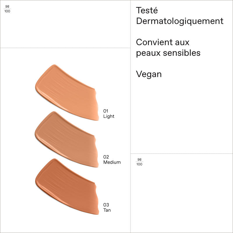 3 TEINTES 01 Light. 02 Medium. 03 Tan.