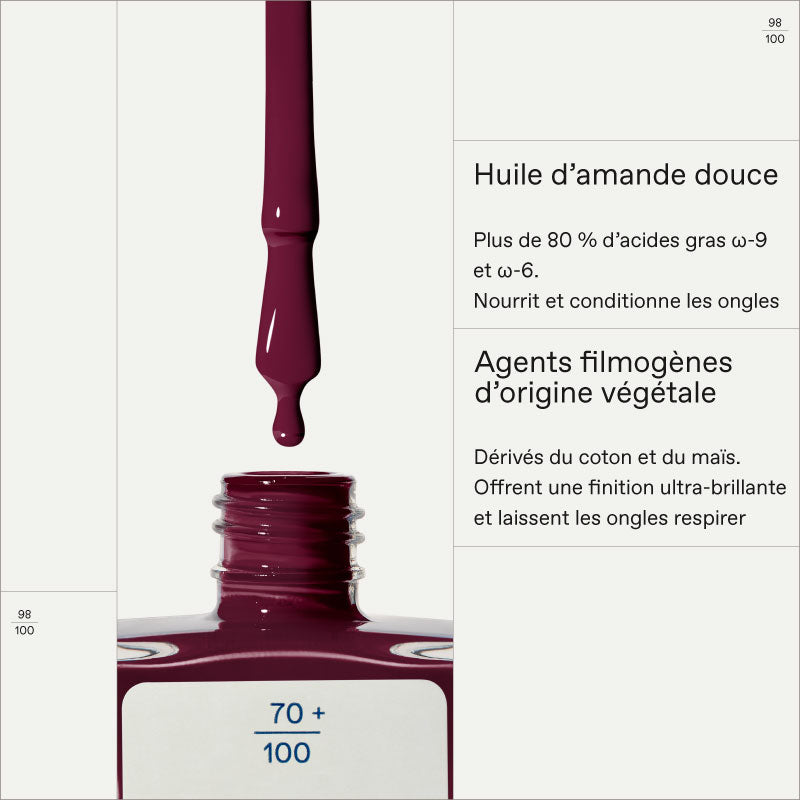 • FILMOGÈNES VÉGÉTAUX – Dérivés du coton et du maïs. Finition ultra brillante, tout en laissant respirer l’ongle.