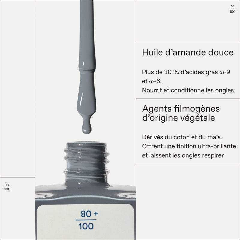Infusé d'Huile d'Amande Douce et de Filmogène Végétaux, il est une alternative naturelle aux vernis à ongles traditionnels, sans compromettre les résultats.