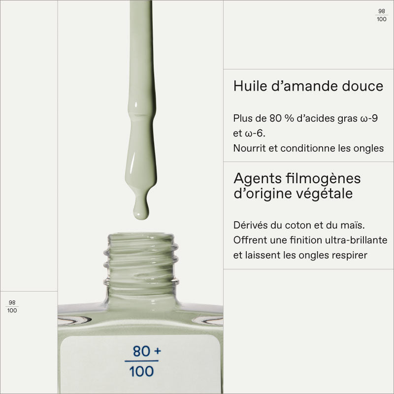 Infusé d'Huile d'Amande Douce et de Filmogène Végétaux, il est une alternative naturelle aux vernis à ongles traditionnels, sans compromettre les résultats.