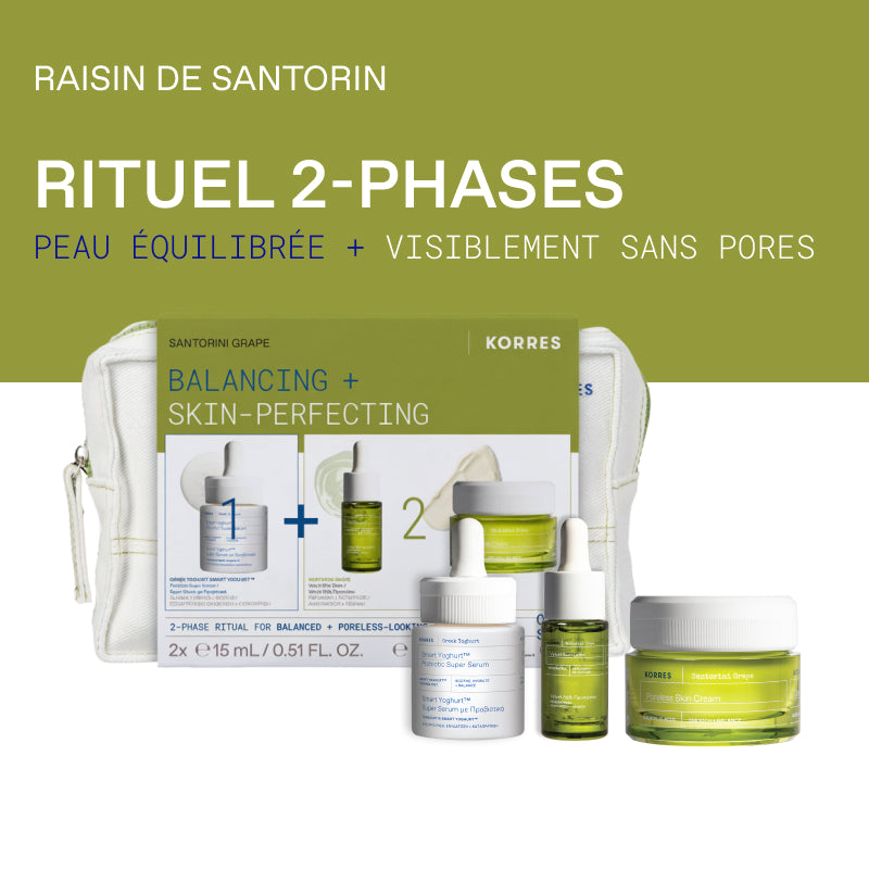 Une belle peau commence par une routine d’équilibre cutané et de soin ciblé. Korres vous fait découvrir la meilleure version de votre peau grâce à un rituel en deux étapes :