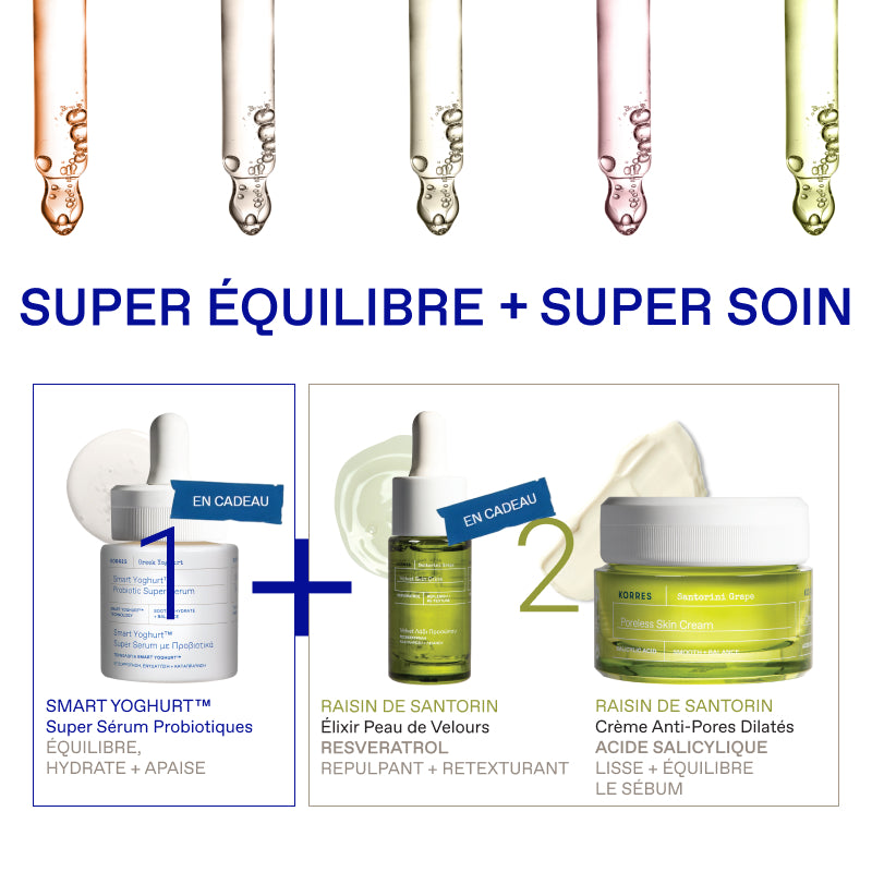SMART YOGHURT™ Super Sérum Probiotiques 15ml (CADEAU) + RAISIN DE SANTORIN Elixir Peau de Velours 15ml (CADEAU) + RAISIN DE SANTORIN Crème Anti-Pores Dilatés 40ml