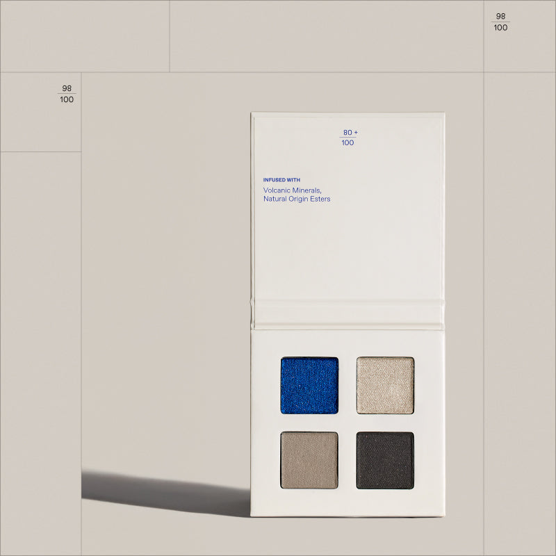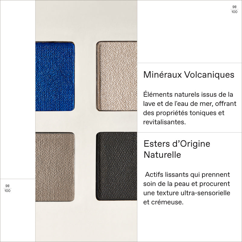 Palette de 4 fards à paupières, couleur en un seul geste, texture crémeuse estompable Infusés de Minéraux Volcaniques et d’Esters d’origine naturelle, des teintes mates ...