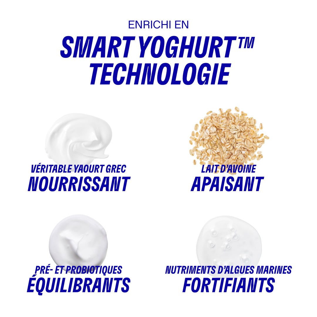Boosté par la Technologie SMART YOGHURT™, ce gel-crème s'adapte aux divers besoins de la peau. Rééquilibre le microbiome stressé + fortifie la barrière cutanée. 95% Peau...