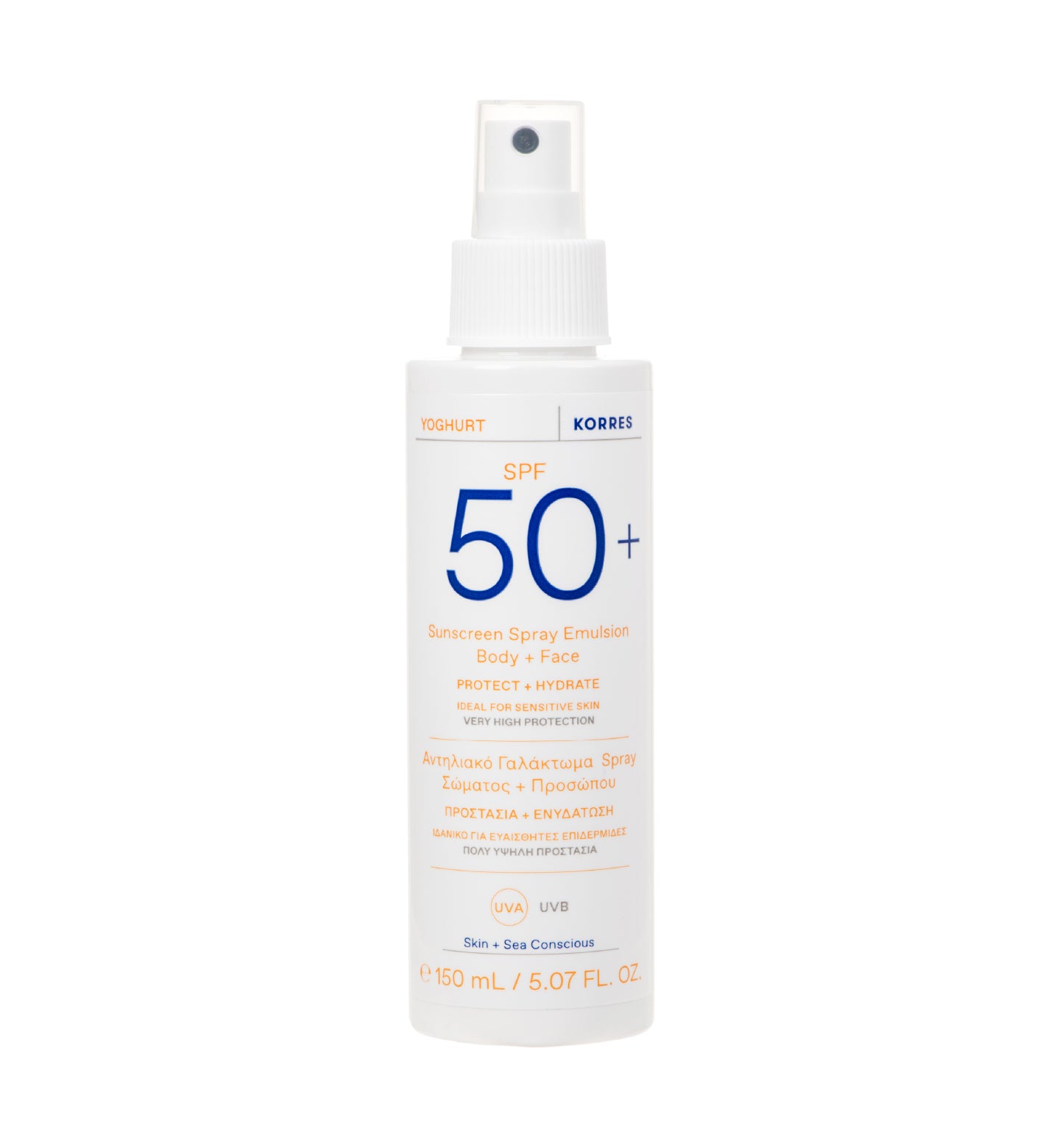 Spray émulsion solaire SPF50+, corps + visage, très haute protection ANTI-UVA + UVB. Convient à toute la famille. Enrichi en Yaourt, idéal peaux sensibles, déshydratées et exposées au soleil.