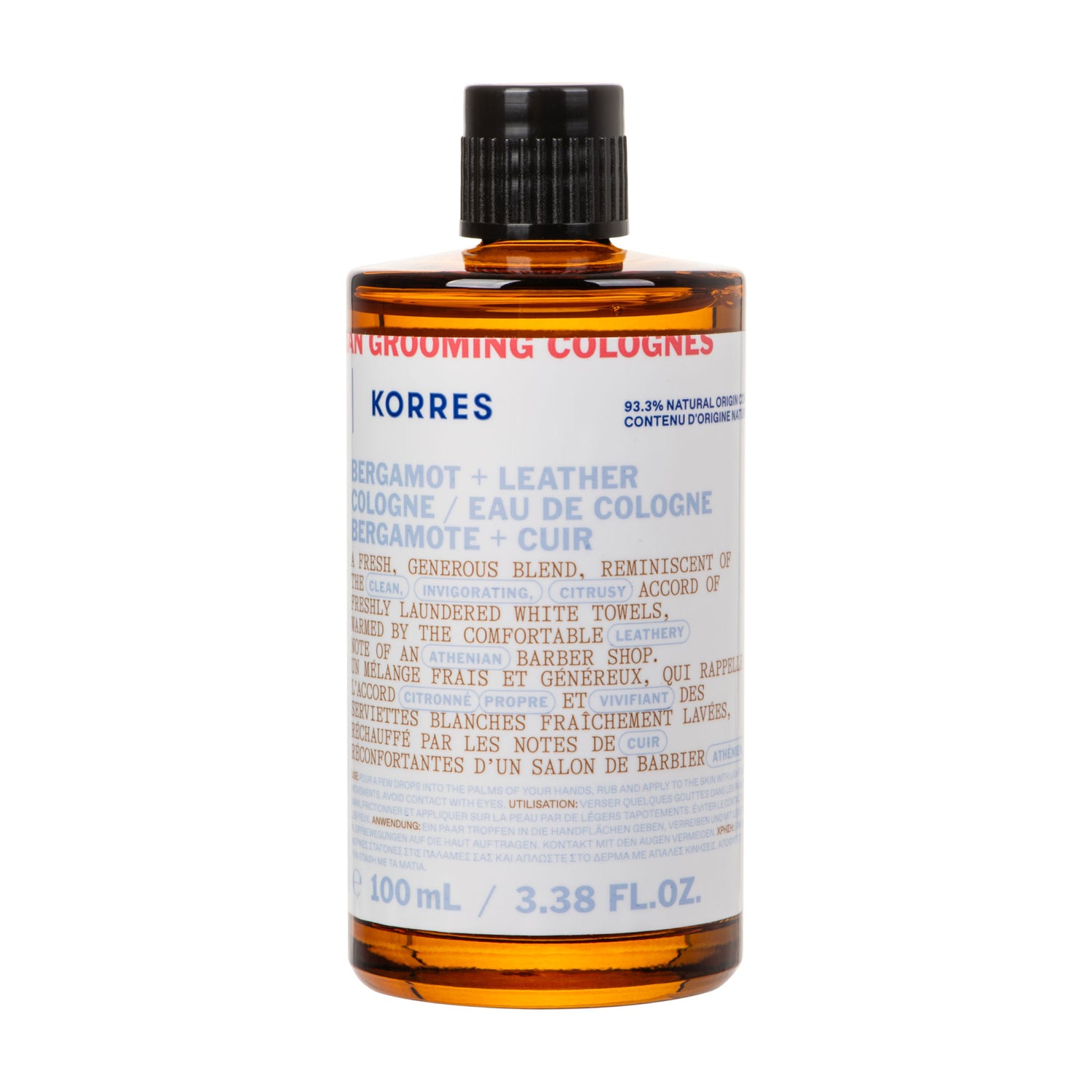 Cologne Bergamote + Cuir 100ml – Un accord propre et citronné réchauffé par la note cuirée du salon de barbier Athénien.