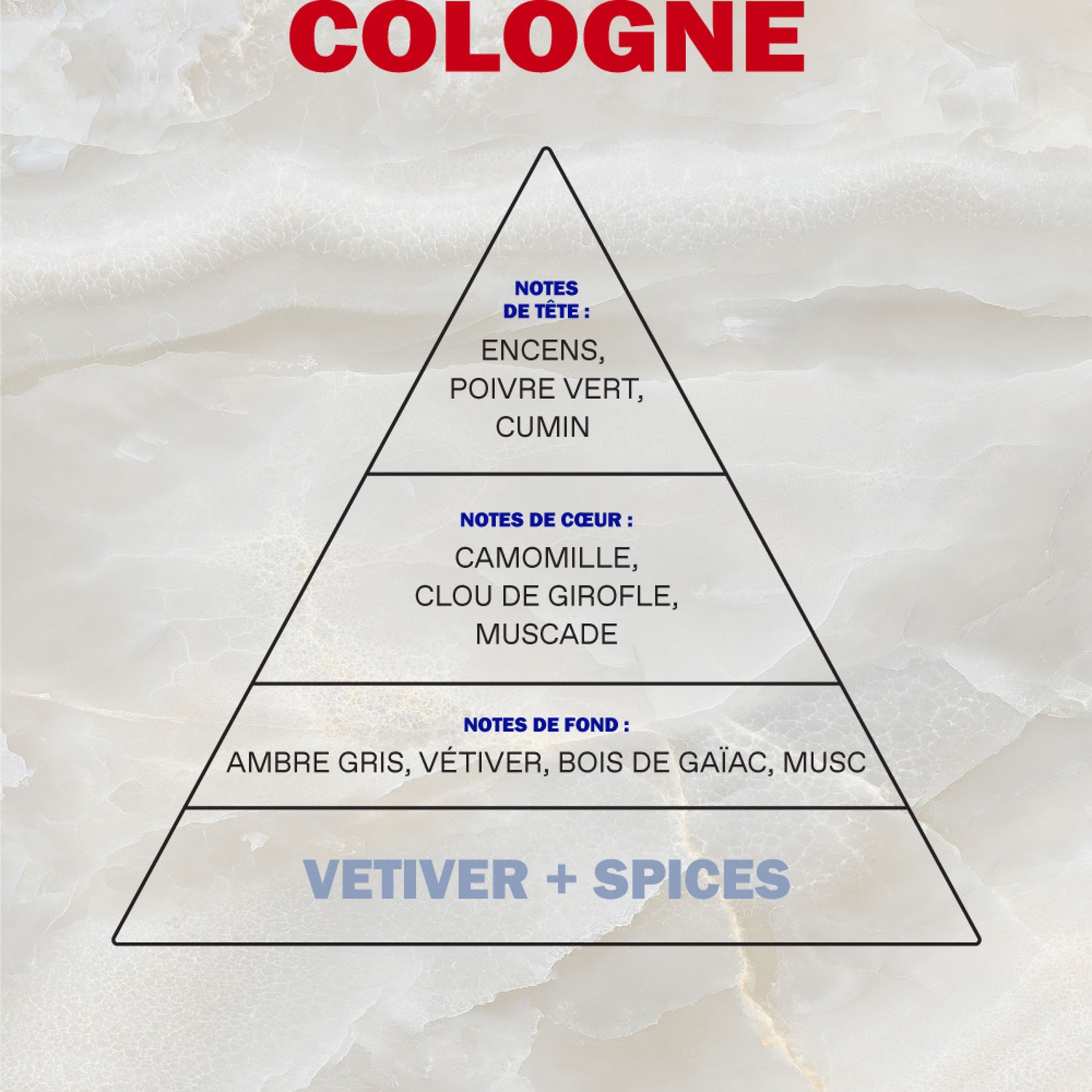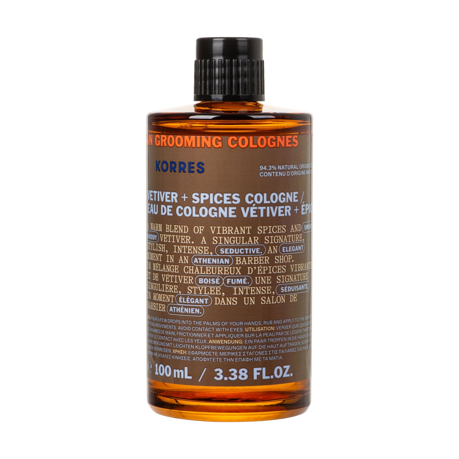 Cologne Vétiver + Épices 100ml – Un mélange chaleureux d'épices vibrantes et de vétiver boisé et fumé.