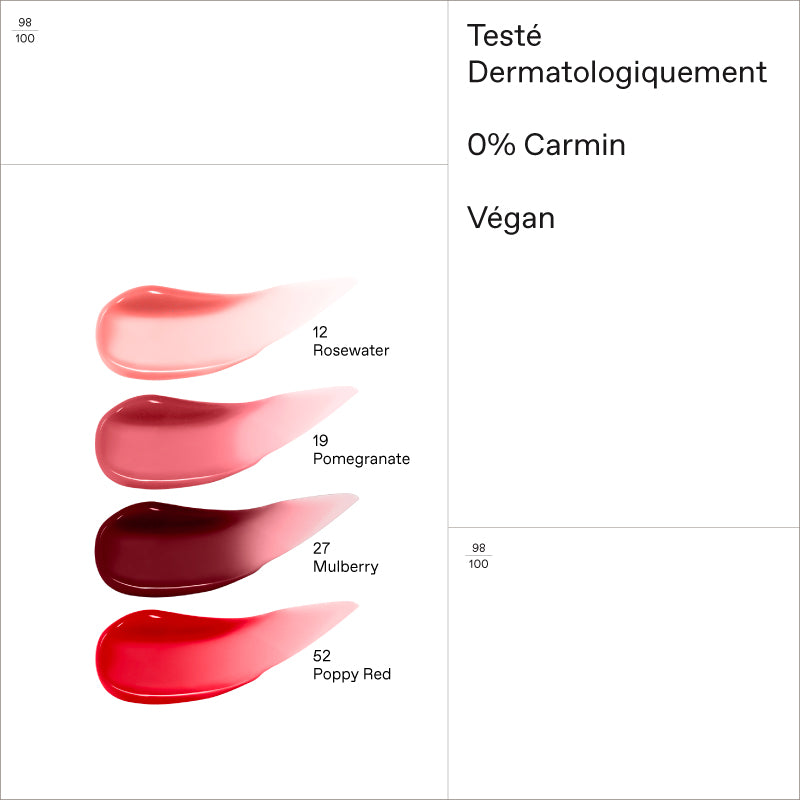 4 TEINTES 12 Rosewater. 19 Pomegranate.  52 Poppy Red. 27 Mulberry.