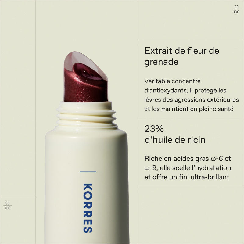 • EXTRAIT DE FLEUR DE GRENADE – Super antioxydant. Maintient les lèvres saines et protégées des facteurs de stress environnementaux.