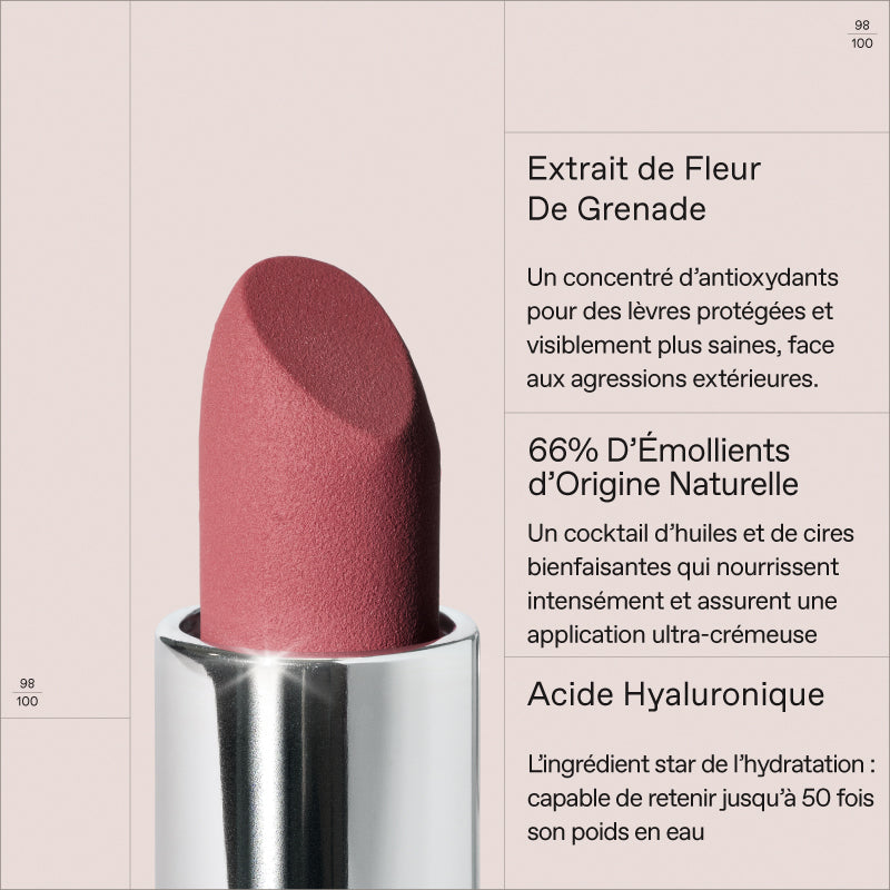 Infusé d’Extrait de Fleur de Grenade et d’Émollients Naturels et d'Acide Hyaluronique pour une tenue confortable et des lèvres lisses et douces.