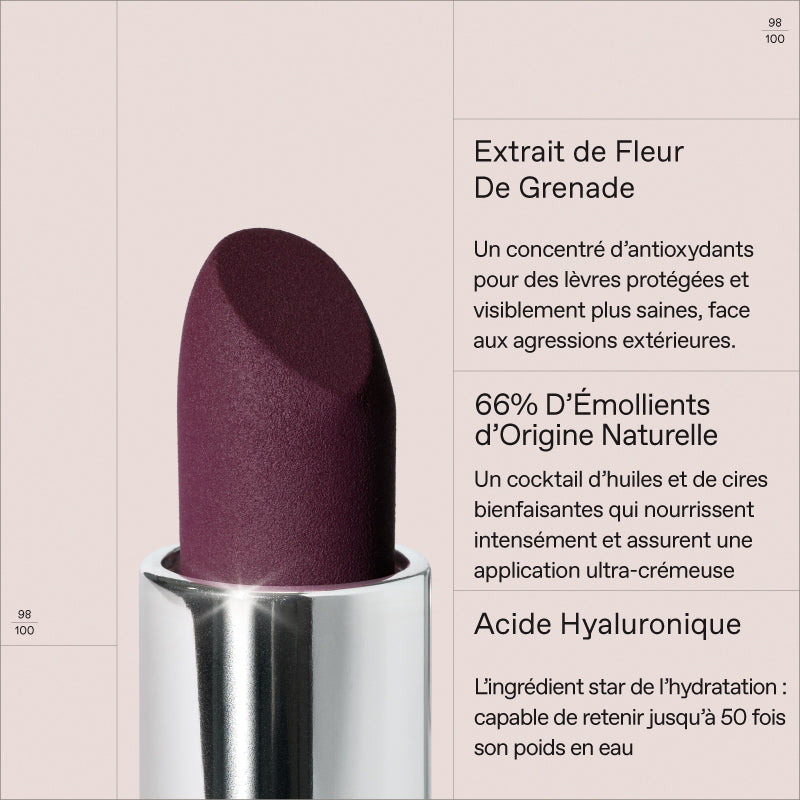 Infusé d’Extrait de Fleur de Grenade et d’Émollients Naturels et d'Acide Hyaluronique pour une tenue confortable et des lèvres lisses et douces.